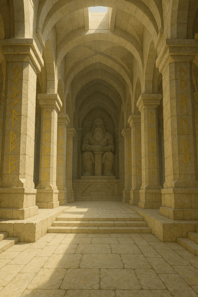 Kveldarᚴ (Kaun)Hache angulaire dressée vers le hautForce, discipline, bravoureDieu de la Guerre et de la forceHonneur, discipline, violence sacrée« Par le bras de Kveldar ! »Casernes, armureries, champs de batailleBriser un marteau miniature avant la guerre pour attirer sa force.