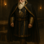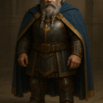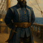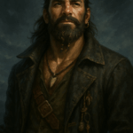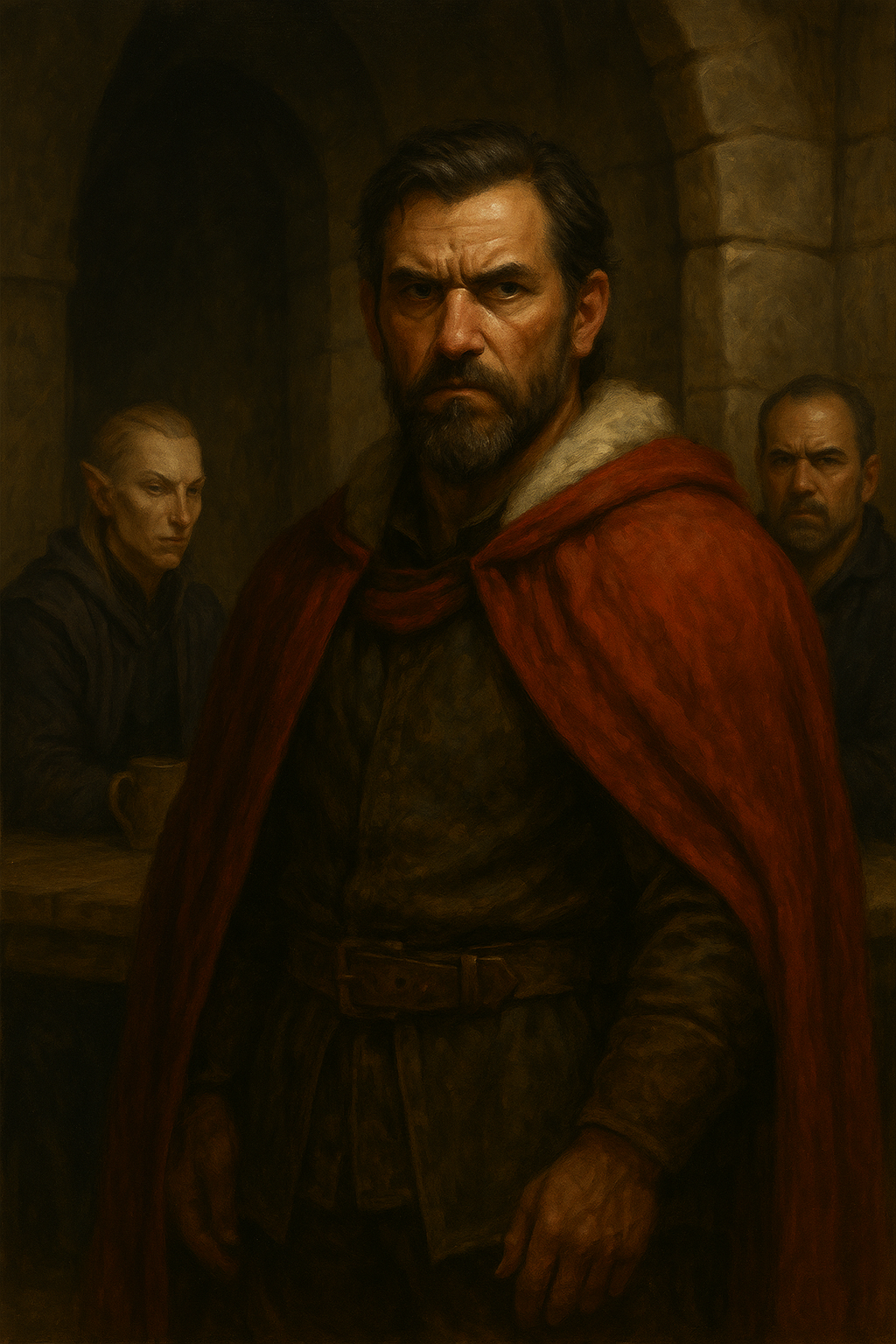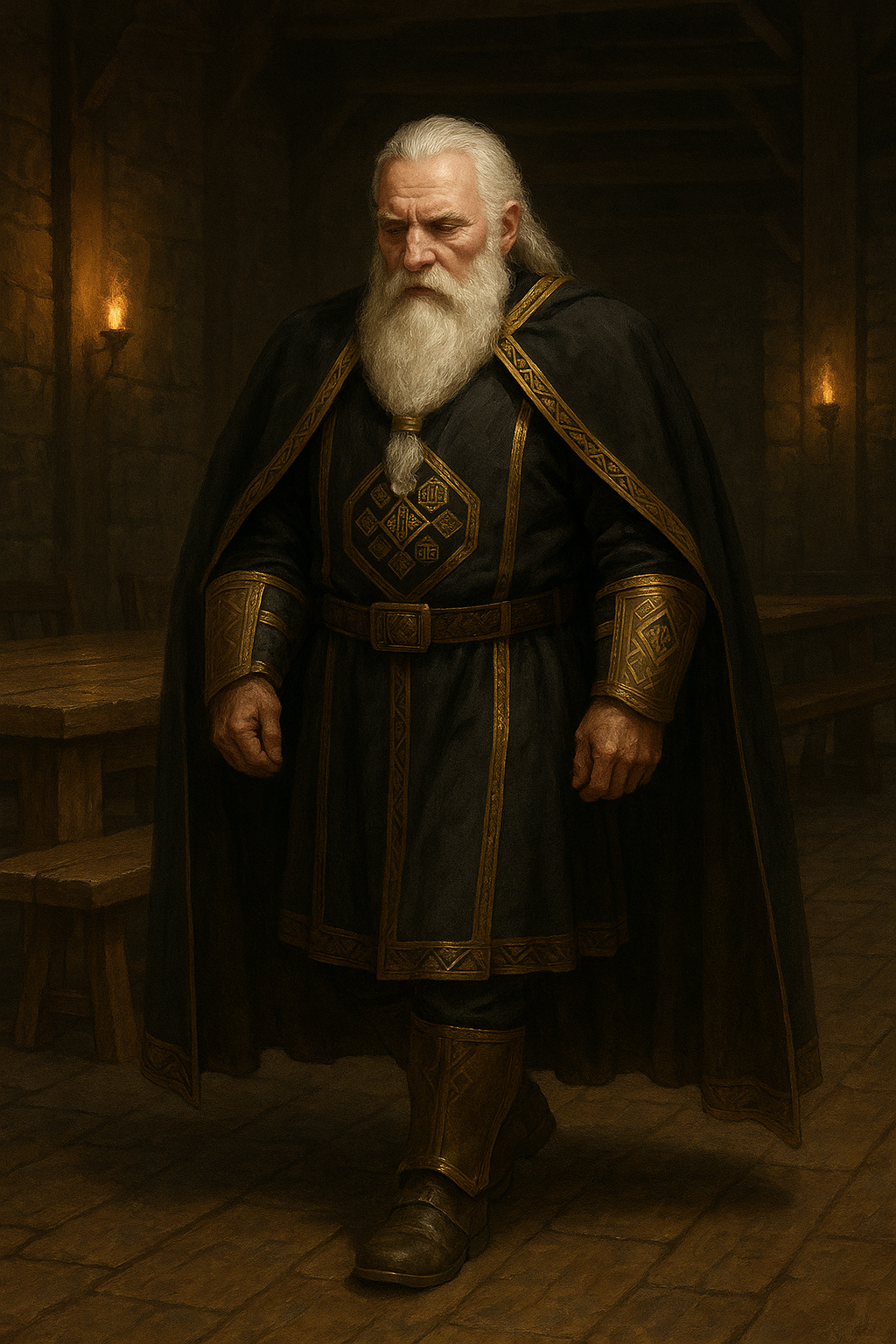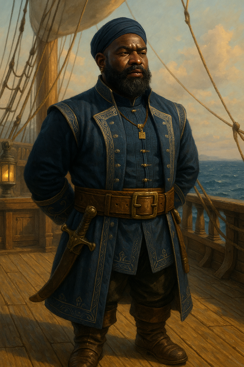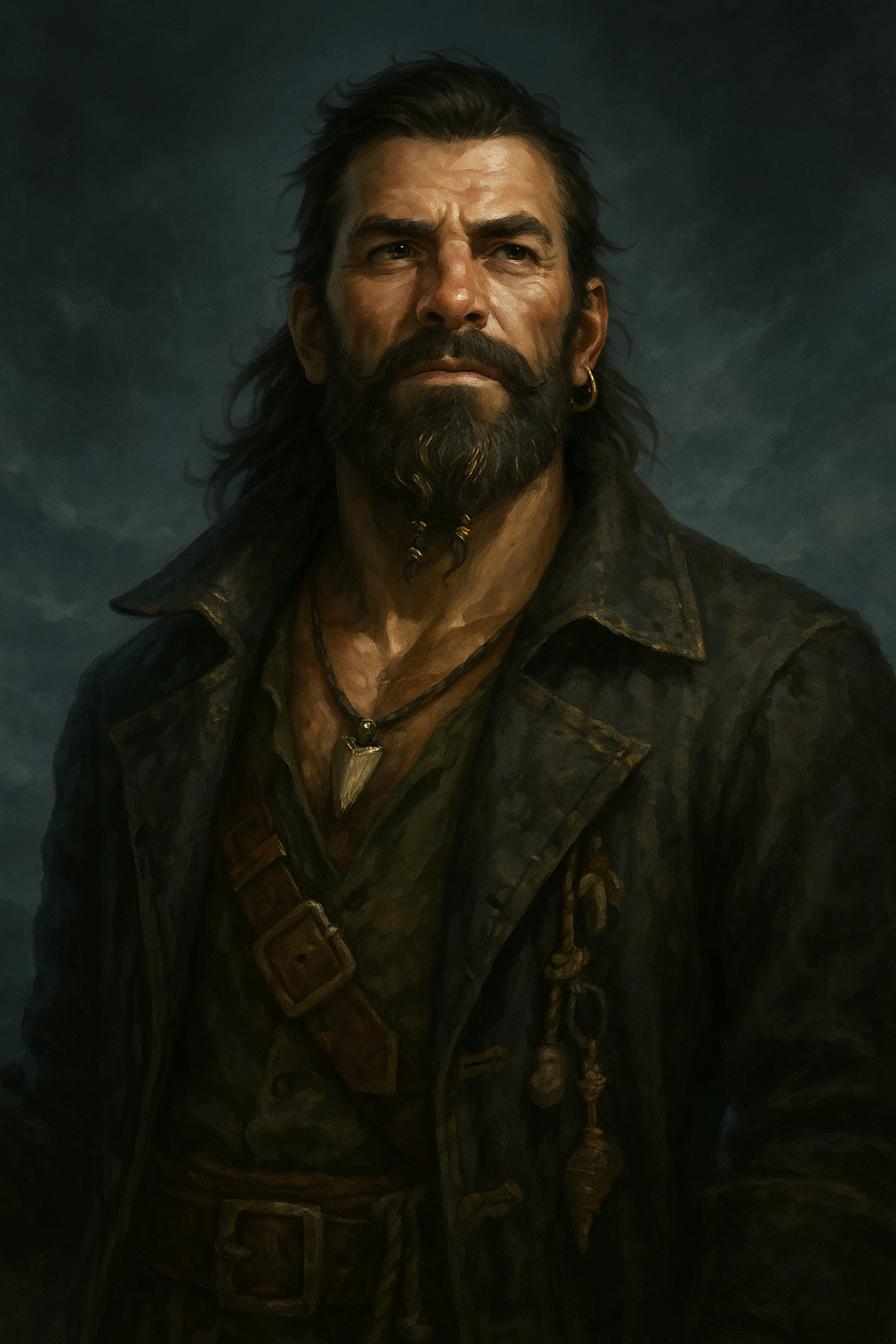 - Description : Imposant, manteau bleu nuit, barbe poivre et sel tressée de perles d’os, regard clair et froid. Charismatique, mystérieux, respecté, stratège pragmatique. Commande la frégate Borrwyn.