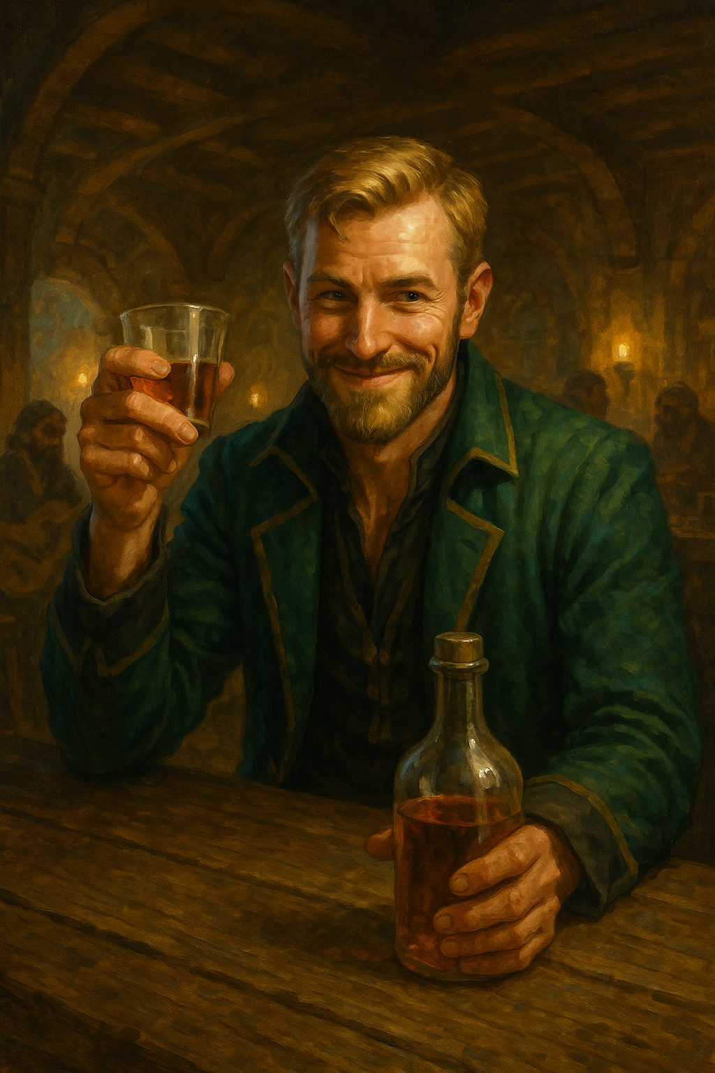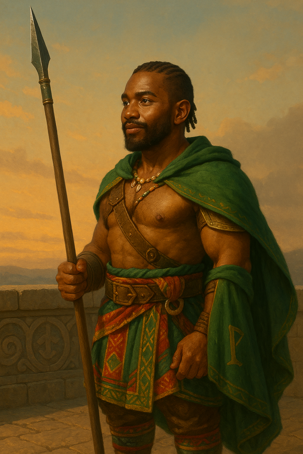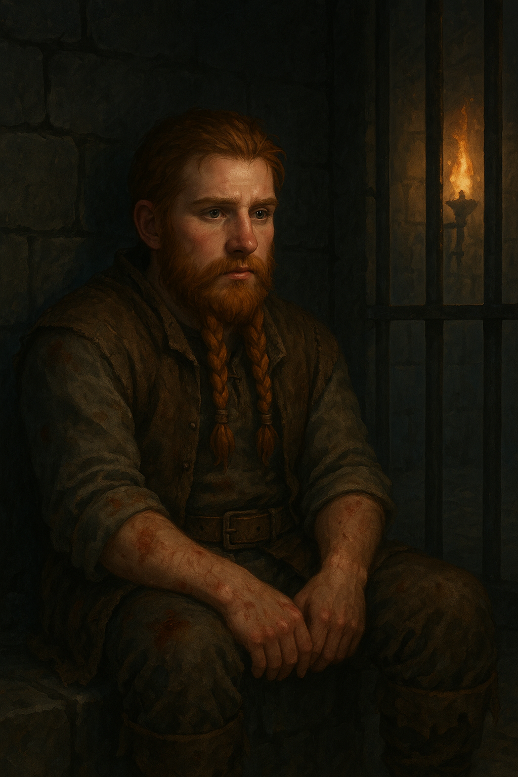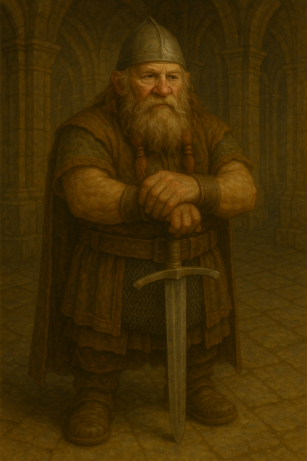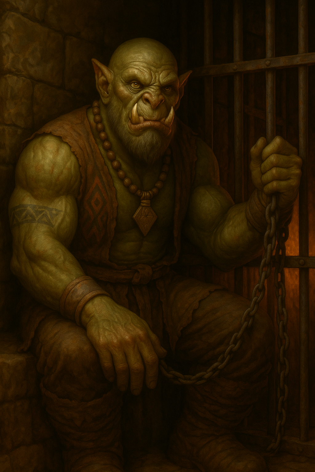 - Description : Imposant, manteau bleu nuit, barbe poivre et sel tressée de perles d’os, regard clair et froid. Charismatique, mystérieux, respecté, stratège pragmatique. Commande la frégate Borrwyn.