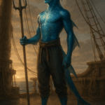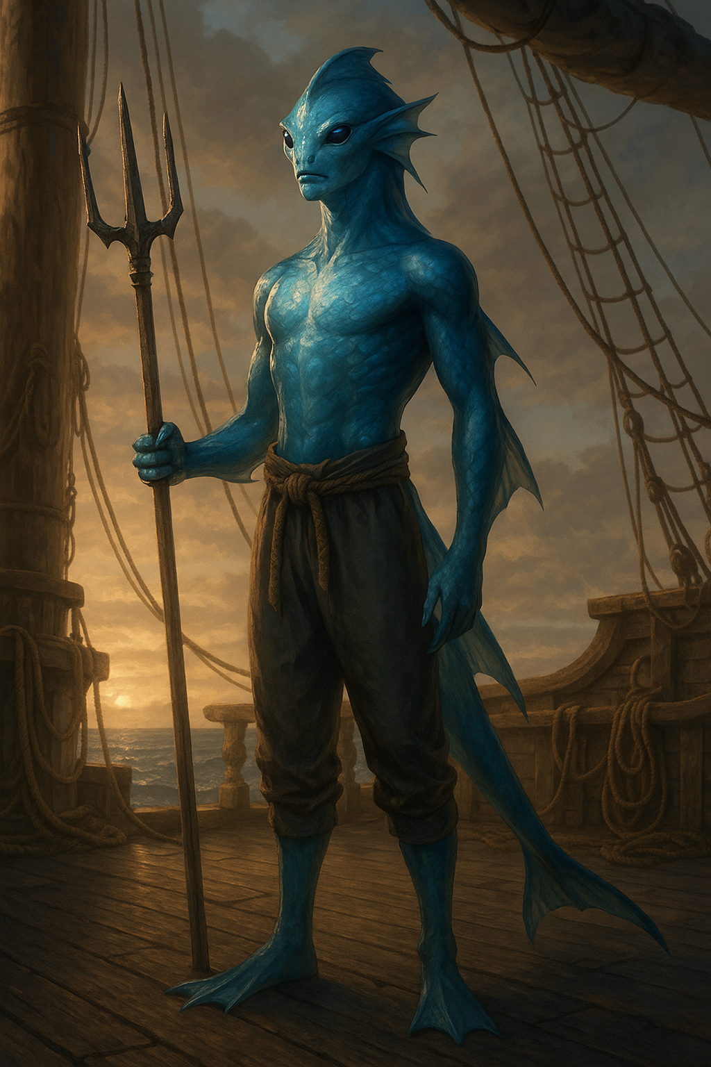 - Description : Peau d’écailles bleu pâle, yeux obliques brillants, bras palmés, trident, nageoires dorsales. Silencieux, imposant, expert en escalade et discrétion. Éclaireur et combattant efficace contre les créatures d’ombre. Cynique mais fiable.
